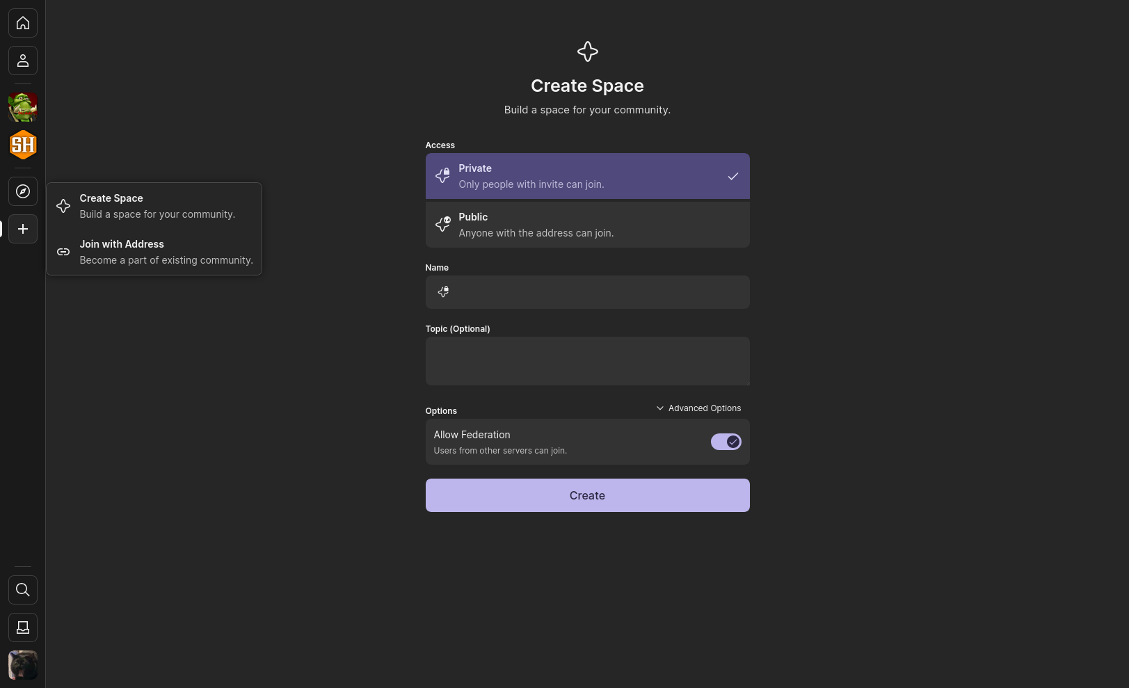 Pour créer un espace, cliquez sur le bouton + dans la barre de gauche, et sélectionnez “Create Space”. Sur la page, choisissez si votre espace est privé (rejoignable uniquement par un lien d’invitation) ou public (rejoignable par tout le monde). Donnez-lui un nom et choisissez si vous souhaitez activer la fédération. Sans la fédération, votre espace ne sera accessible qu’aux personnes inscrites sur le même serveur d’accueil que vous.