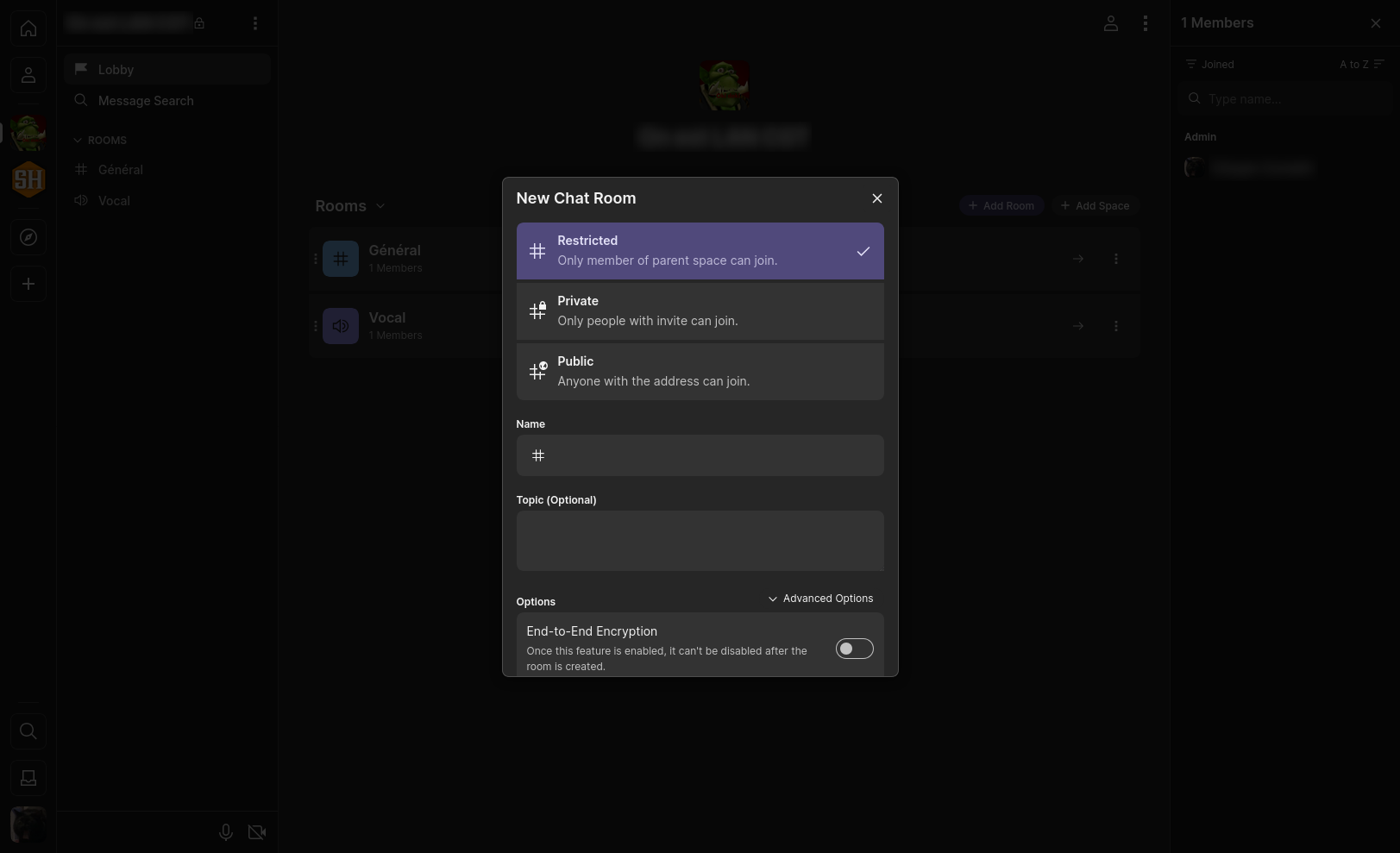 Pour créer un salon, rendez-vous sur votre espace et cliquez sur Lobby en haut à gauche. Cette page est l’accueil de votre espace, sur lequel vous pouvez ajouter des salons. Cliquez sur Add Room puis sélectionnez le type de salon à créer. Dans la fenêtre qui s’ouvre, choisissez le nom du salon et ses restrictions d’accès : un salon en mode Restricted ne sera accessible qu’aux membres de l’espace. Un salon privé ne sera accessible qu’aux personnes ayant reçu une invitation et un salon public sera accessible à tous, y compris aux non-membres de l’espace. Vous pouvez également décider si votre salon doit être chiffré de bout en bout ou non en cochant ou décochant End-to-End Encryption.