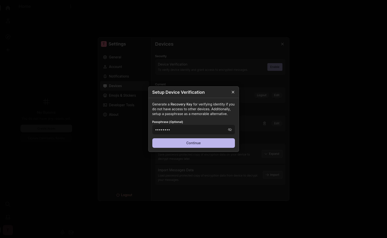 Pour activer la vérification de vos sessions, cliquez sur votre photo de profil en bas à gauche puis naviguez vers Devices. Dans Device Verification, cliquez sur Enable. Créez un mot de passe de chiffrement (différent de votre mot de passe de compte) et entrez-le dans le champ. Téléchargez ensuite la clé de récupération et gardez-la en lieu sûr : elle vous permettra de vérifier votre session si vous avez perdu votre mot de passe de chiffrement.