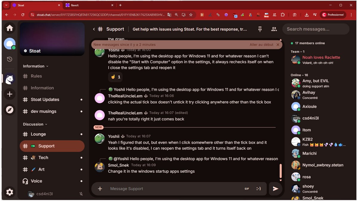 Bien qu’il s’agisse d’un projet de longue date, il a longtemps été maintenu par une poignée de personnes, ce qui fait que le logiciel a évolué plutôt lentement et comporte encore quelques bugs et fonctionnalités manquantes (notamment les appels vidéo et le partage d’écran). Cependant, Stoat a reçu un important afflux d’utilisateur·ice·s et de développeur·euse·s suite à l’annonce de Discord, ce qui devrait lui permettre d’après son équipe de grandement accélerer son amélioration dans les semaines à venir. Si vous avez besoin des fonctions de caméra et de partage d’écran, vous pouvez créer un lien permanent sur Jitsi en attendant l’implémentation officielle.